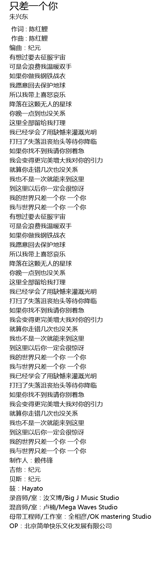 | [01:14.973] | 我的世界只差一个你 一个你 |