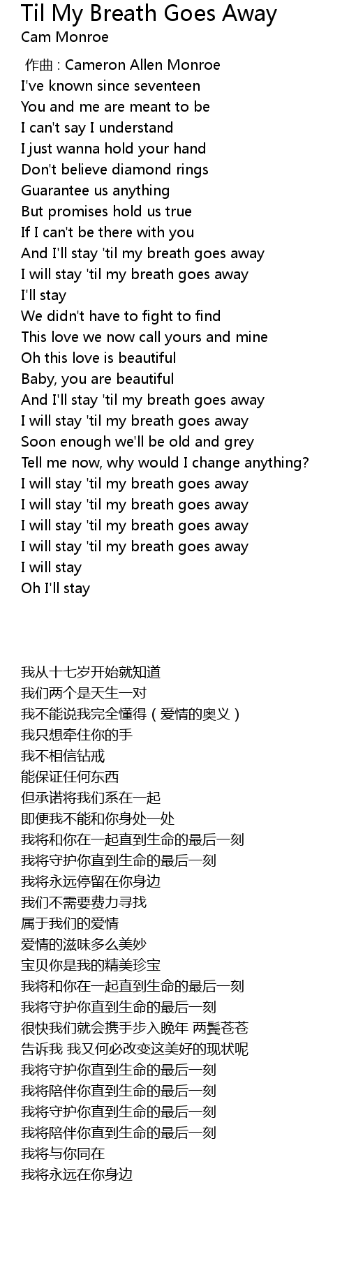 | [00:28.590] | And I' ll stay ' til my breath goes away |