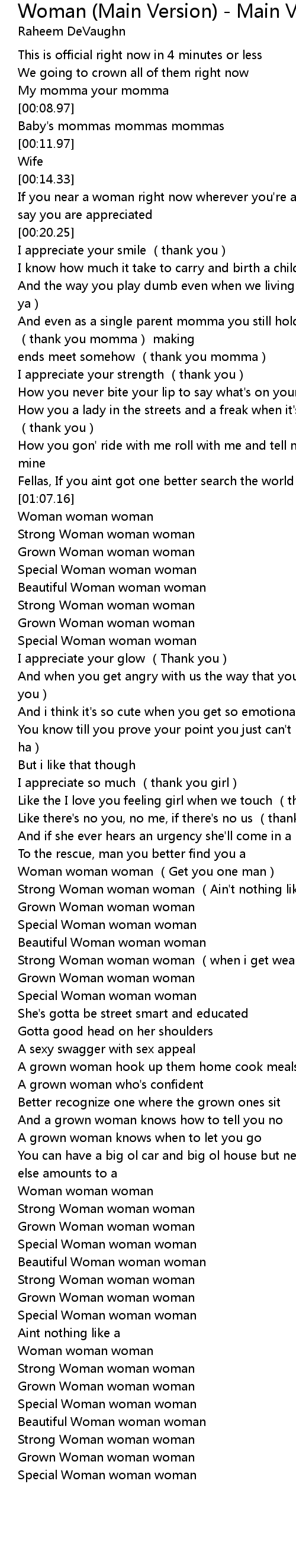 | [00:15.20] | If you near a woman right now wherever you're at just turn to em and say you are appreciated |