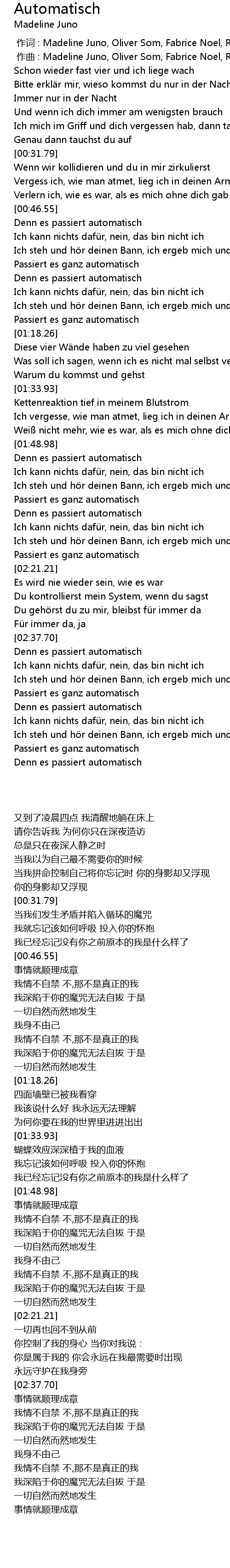| [00:01.000] | 作曲 : Madeline Juno, Oliver Som, Fabrice Noel, Rainer Rütsch |