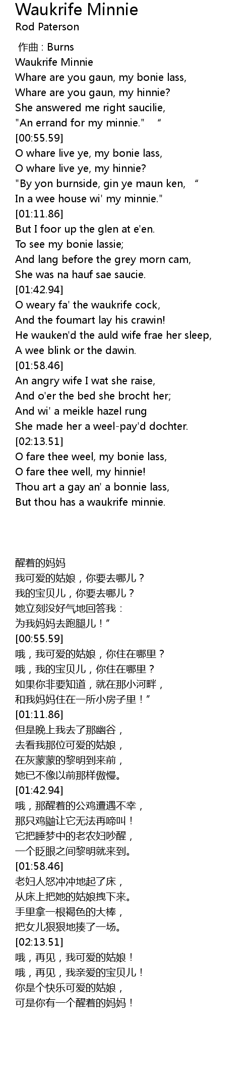 | [02:41.26] | But thou has a waukrife minnie. |