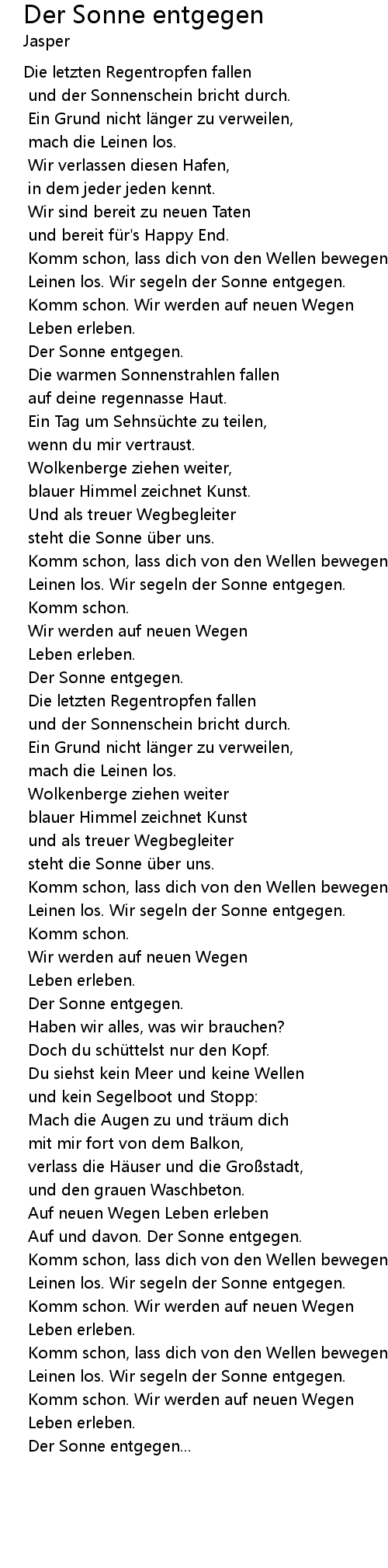 | Leinen los. Wir segeln der Sonne entgegen. | |