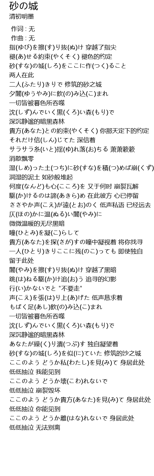 | [01:09.447] | 湿(しめ)った土(つち)に砂(すな)を積(つ)めば崩(くず)れて 润湿的泥土 如砂般堆起 |