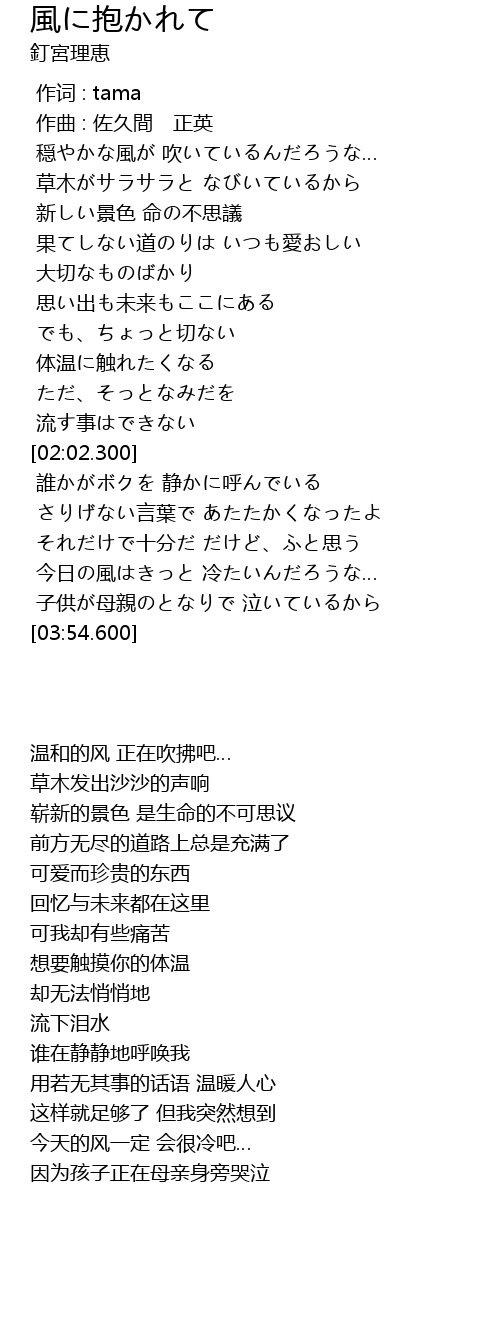 | [03:24.490] | 今日の風はきっと 冷たいんだろうな… |
