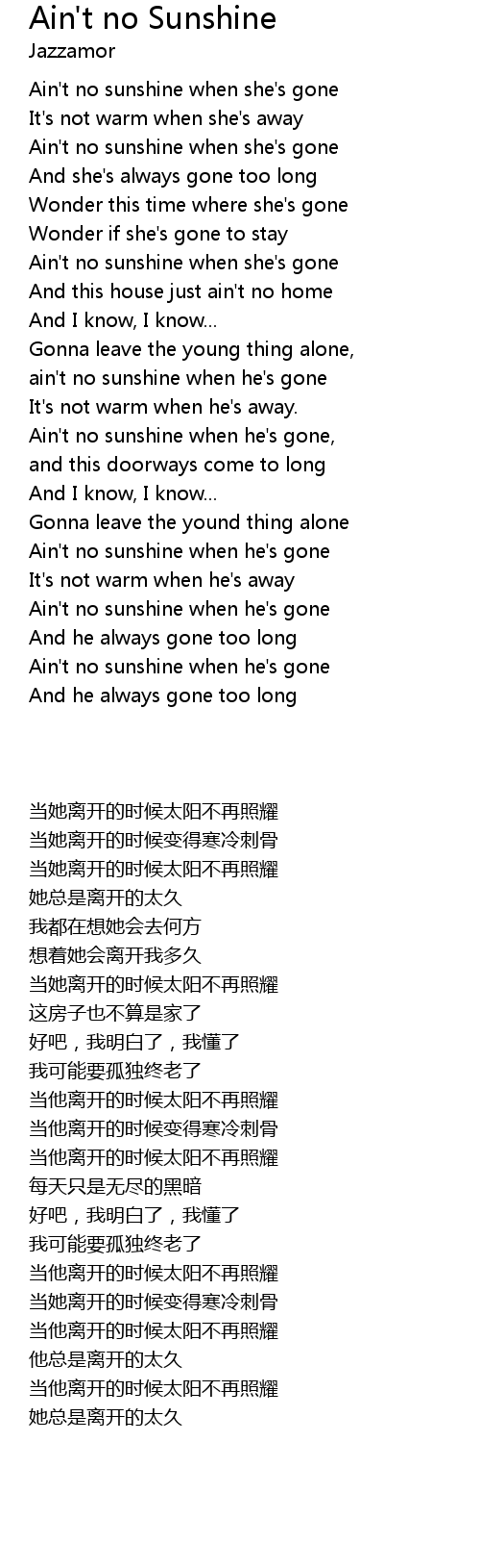 | [03:20.410] | Ain' t no sunshine when he' s gone |
