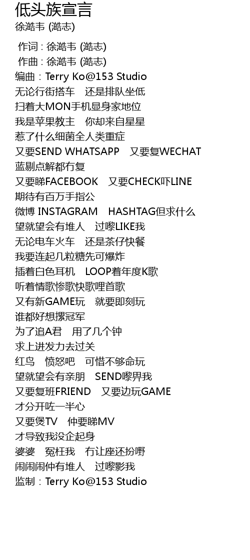 | [00:03.62] | 编曲:Terry Ko@153 Studio |