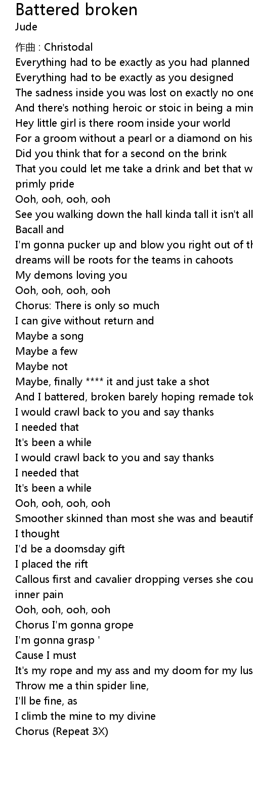 | Callous first and cavalier dropping verses she could hear the sad refrain of inner pain | |