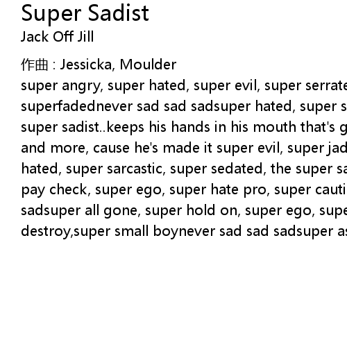 | super angry, super hated, super evil, super serrated, super guitar, superfadednever sad sad sadsuper hated, super sarcastic, super sedated, the super sadist..keeps his hands in his mouth that's gold platedhates himself more and more, cause he's made it super evil, super jadednever sad sad sadsuper hated, super sarcastic, super sedated, the super sadist...super high tech, super pay check, super ego, super hate pro, super cautious,super nauseousnever sad sad sadsuper all gone, super hold on, super ego, super phenomenon, super destroy,super small boynever sad sad sadsuper asshole, super nothing.. |