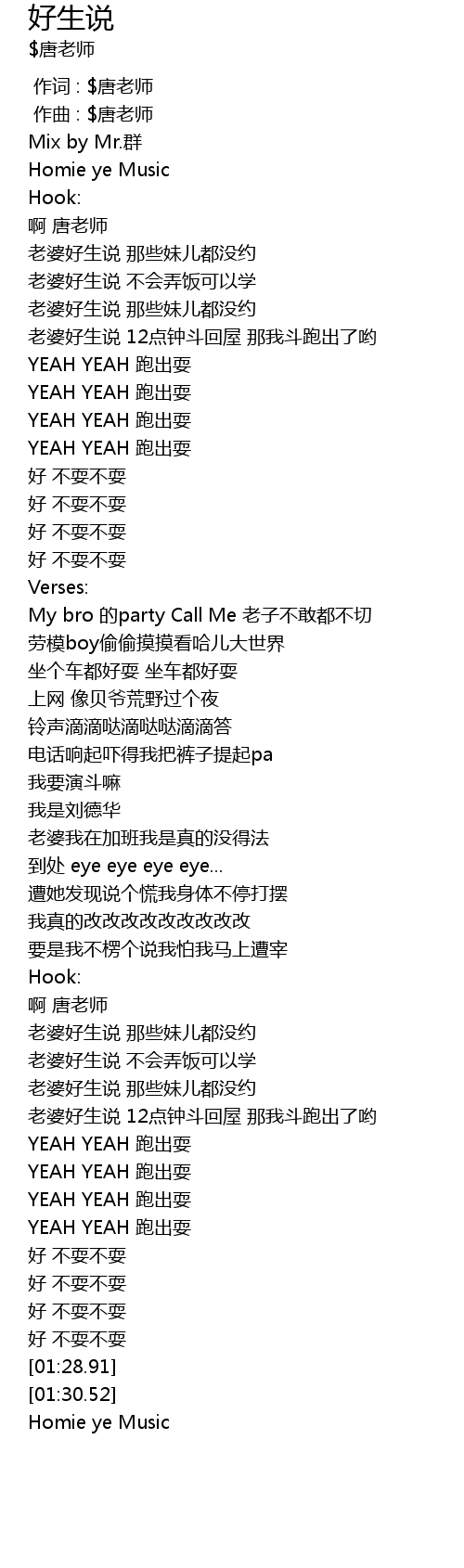 | [00:26.99] | My bro de party Call Me lǎo zi bù gǎn dōu bù qiè |