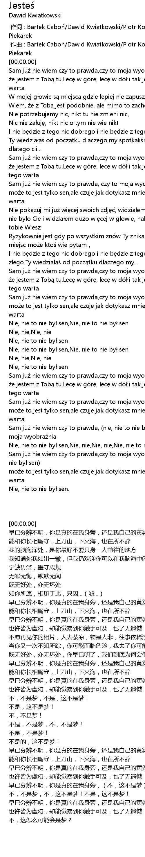 | [00:00.000] | zuò cí : Bartek Cabo Dawid Kwiatkowski Piotr Konca Sebastian Piekarek |
