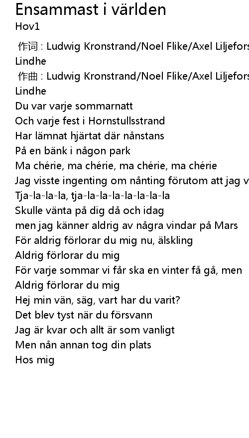 | [00:00.000] | zuò cí : Ludwig Kronstrand Noel Flike Axel Liljefors Jansson Dante Lindhe |