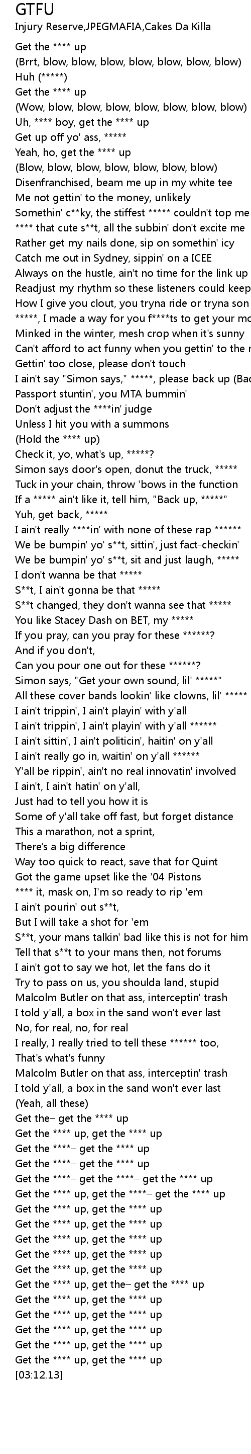 | [03:02.96] | Get the **** up, get the **** up |