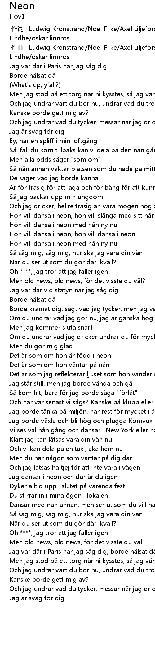 | [00:53.91] | Hon vill dansa i neon med nån ny nu |