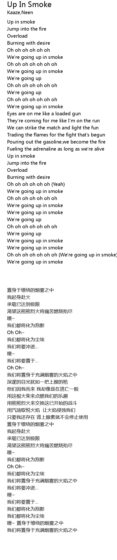 | [02:33.20] | Oh oh oh oh oh oh oh (We're going up in smoke) |