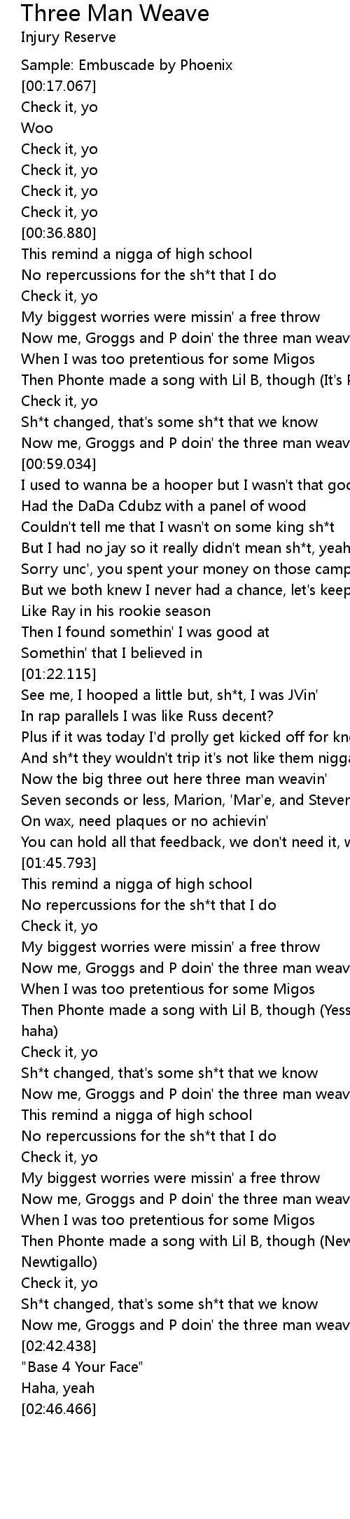 Now me, Groggs and P doin' the three man weave, though |