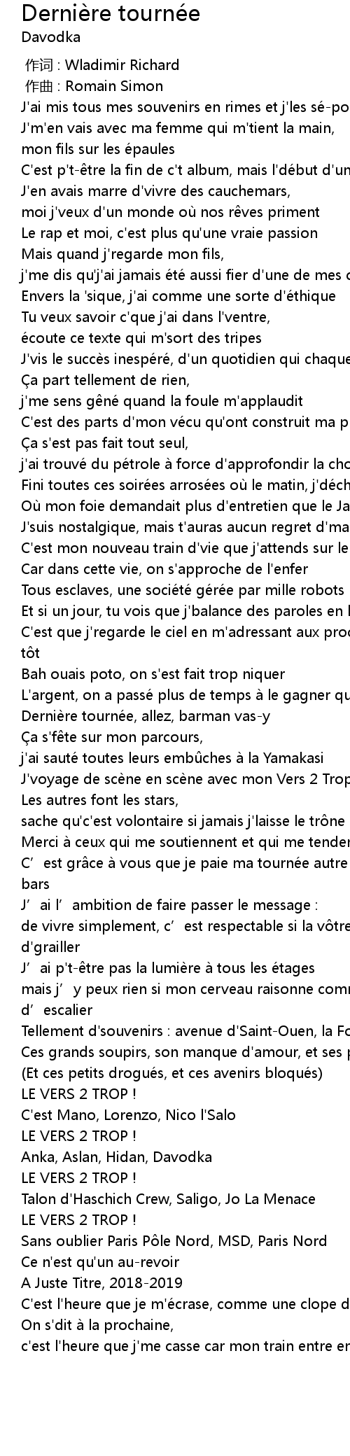 | [01:01.56] | C' est que j' regarde le ciel en m' adressant aux proches partis trop t t |