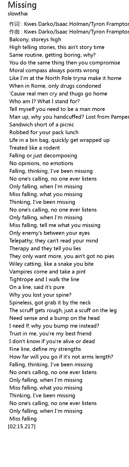 | [00:45.057] | Falling, thinking, I' ve been missing |