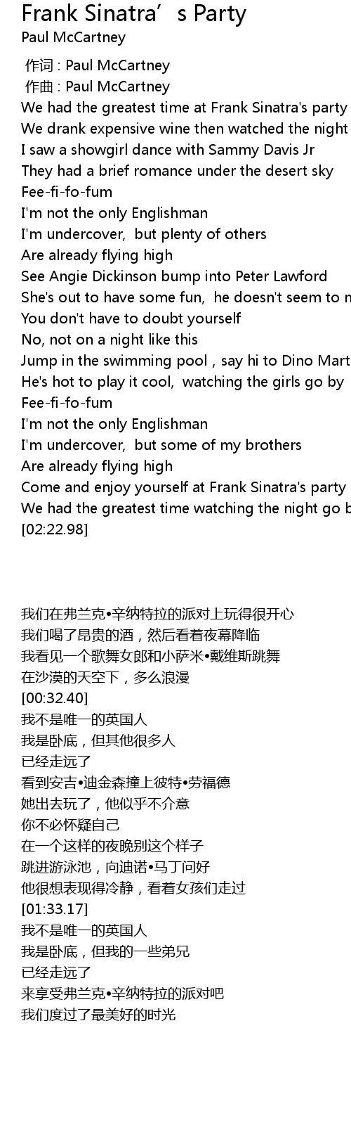 | [00:10.35] | We had the greatest time at Frank Sinatra's party |