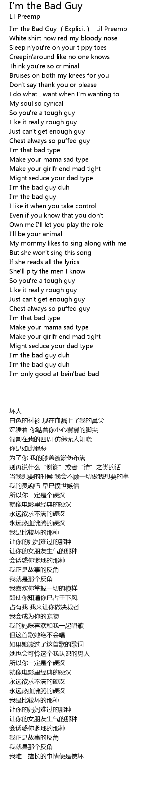 | [00:00.242] | I'm the Bad Guy (Explicit) -Lil Preemp |