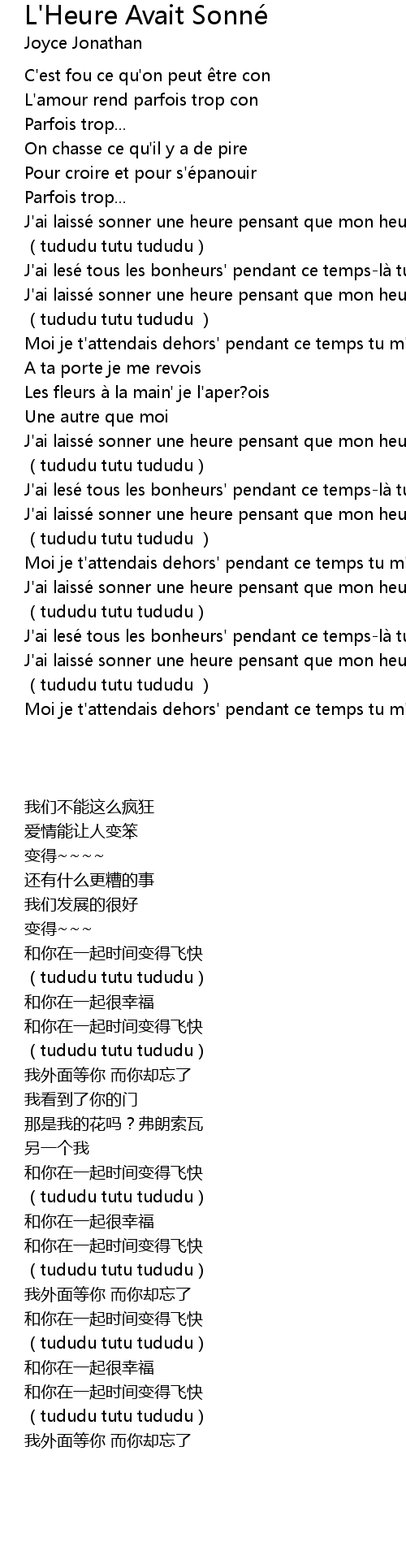 | [02:10.71] | J' ai laisse sonner une heure pensant que mon heure avait sonne |