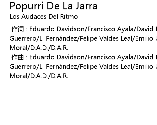 | [00:00.000] | 作曲 : Eduardo Davidson/Francisco Ayala/David Murgia/J. Guerrero/L. Fernández/Felipe Valdes Leal/Emilio Uranga/L. De Juan D. Moral/D.A.D./D.A.R. |