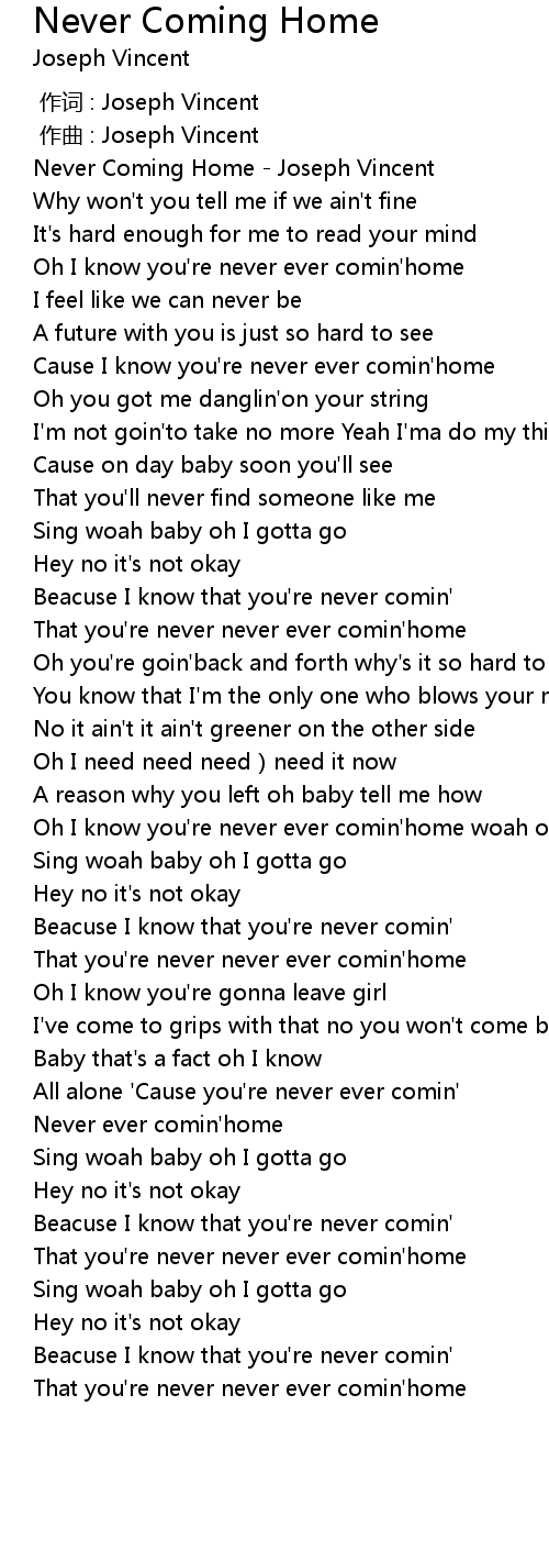 | [00:00.500] | Never Coming Home Joseph Vincent |