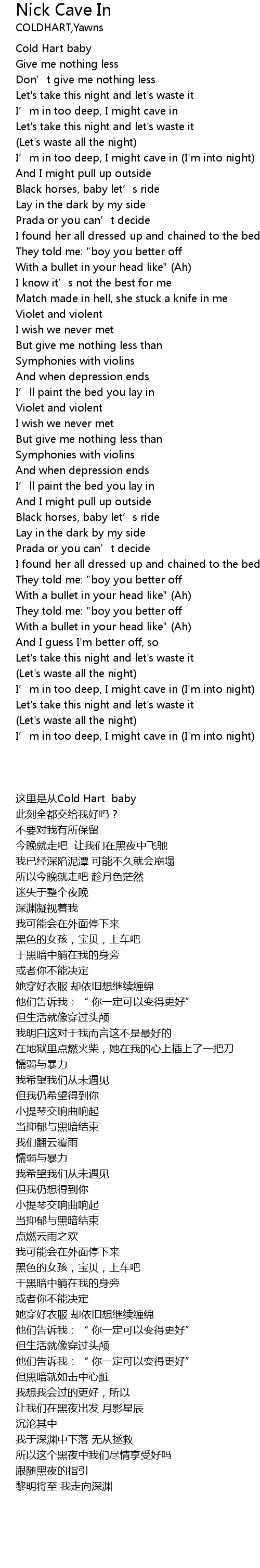 | [00:32.85] | I' m in too deep, I might cave in I' m into night |