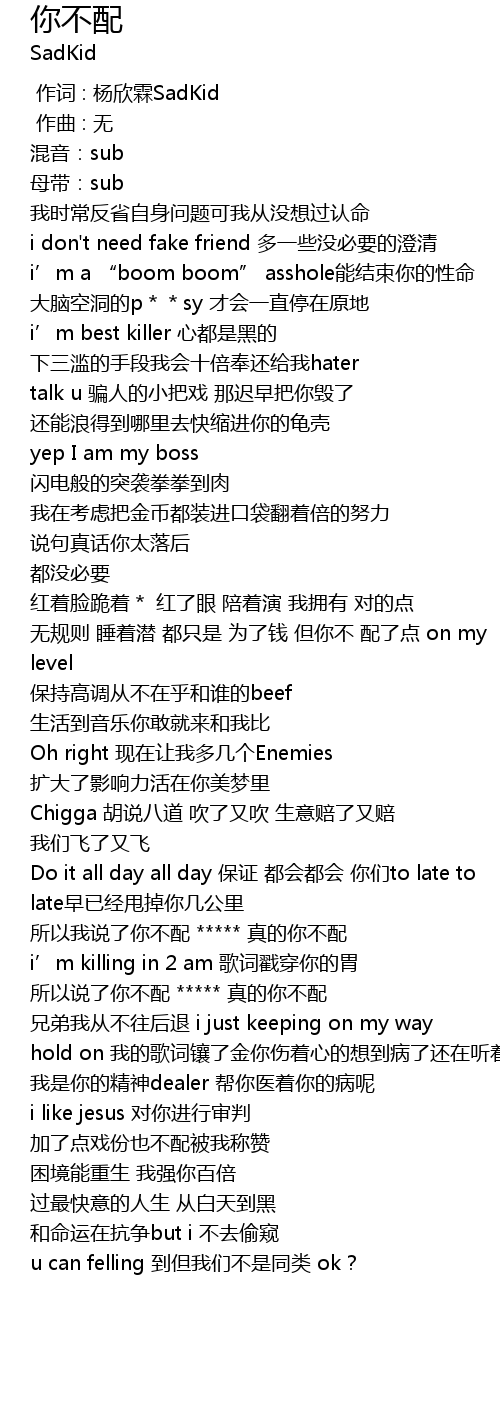 | [01:11.432] | 所以我说了你不配 ***** 真的你不配 |