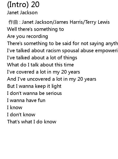 | [00:00.000] | 作曲 : Janet Jackson/James Harris/Terry Lewis |
