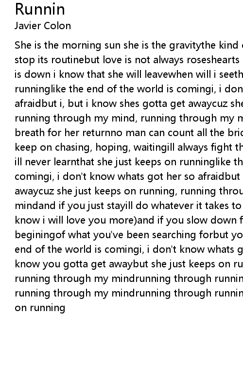 She is the morning sun she is the gravitythe kind of girl that makes the world stop its routinebut love is not always roseshearts get brokenand when my guard is down i know that she will leavewhen will i seethat she just keeps on runninglike the end of the world is comingi, i don't know whats got her so afraidbut i, but i know shes gotta get awaycuz she just keeps on running, running through my mind, running through my mindagain she left wont hold my breath for her returnno man can count all the bridges that shes burnedbut i just keep on chasing, hoping, waitingill always fight this war cuz lovers never learn ill never learnthat she just keeps on runninglike the end of the world is comingi, i don't know whats got her so afraidbut i, but i know shes gotta get awaycuz she just keeps on running, running through my mind, running through my mindand if you just stayill do whatever it takes to love you more ( don't you know i will love you more)and if you slow down for a minutethis could be the beginingof what you've been searching forbut you just keep on runninglike the end of the world is comingi, i don't know whats got you so afraidbut i, but i know you gotta get awaybut she just keeps on running, running through my mind, running through my mindrunning through running through my mindrunning through running through my mindrunning through running through my mindbut you just keep on running