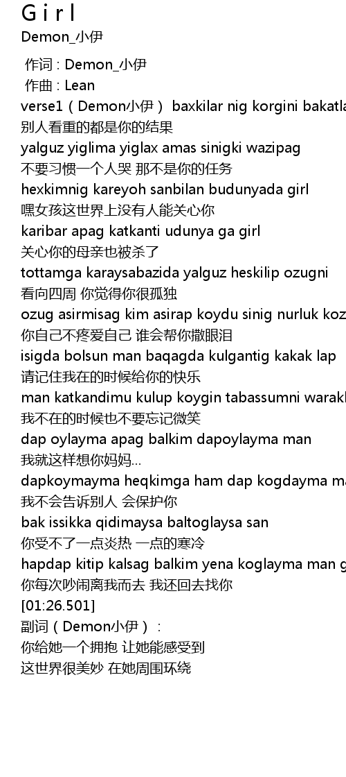 | [00:07.247] | verse1(Demon小伊) baxkilar nig korgini bakatla sinig natijag |