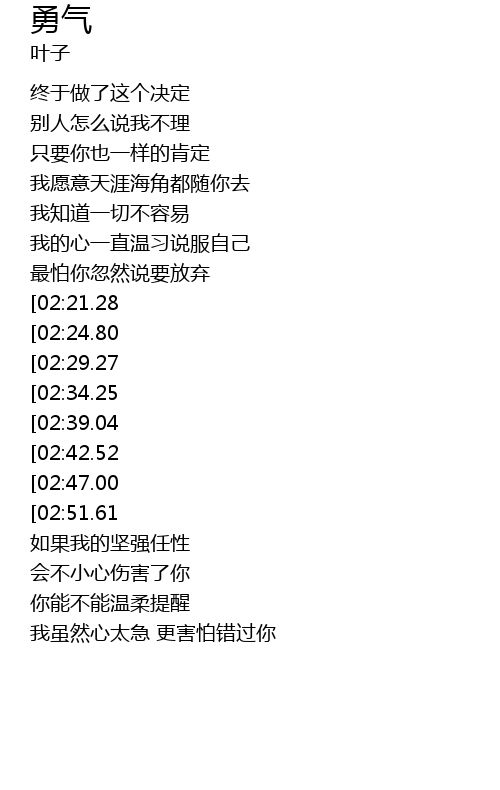 | [03:19.15][02:21.28][01:05.49] | 爱真的需要勇气 |