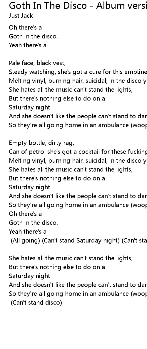 Goth in the disco, [x2] (All going) (Can't stand Saturday night) (Can't stand disco) [x2] |