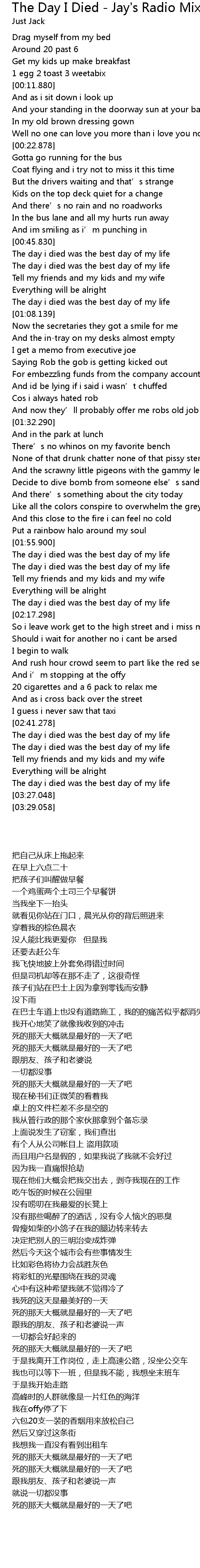 | [02:32.798] | 20 cigarettes and a 6 pack to relax me |