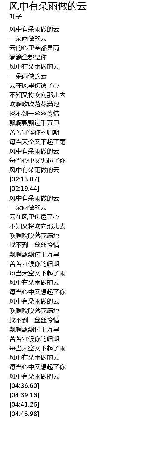 | [04:13.75] | fēng zhōng yǒu duǒ yǔ zuò de yún |