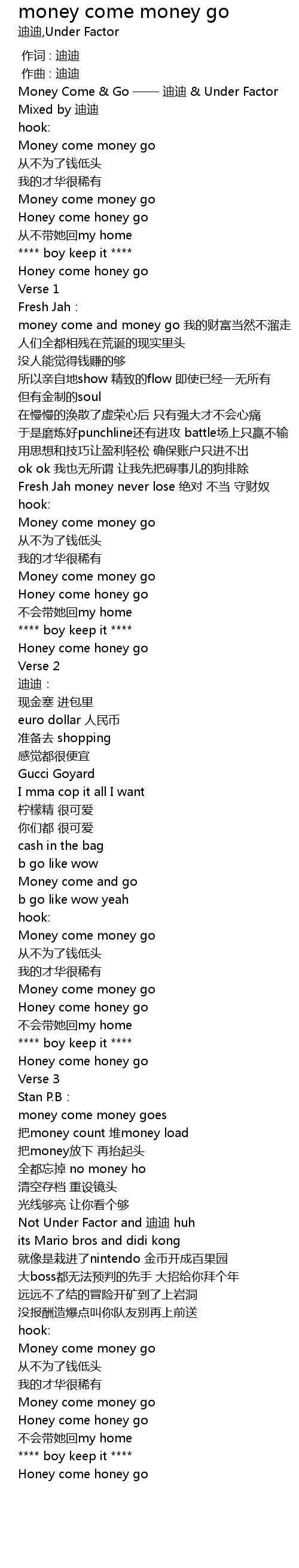 | [00:00.644] | Money Come & Go —— 迪迪 & Under Factor |