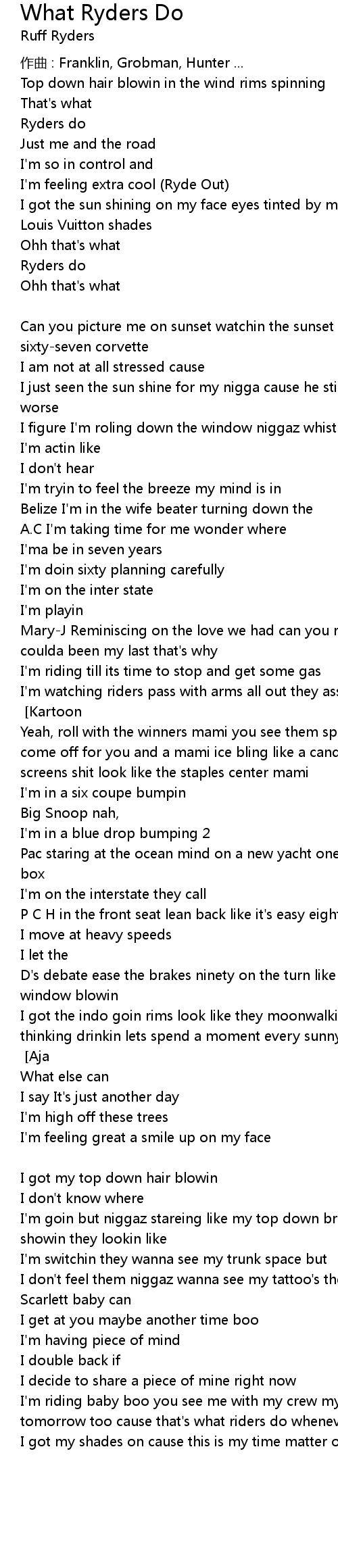 | I' m riding baby boo you see me with my crew my bitches callin in sick ridin tomorrow too cause that' s what riders do whenever the sun shines you see | |