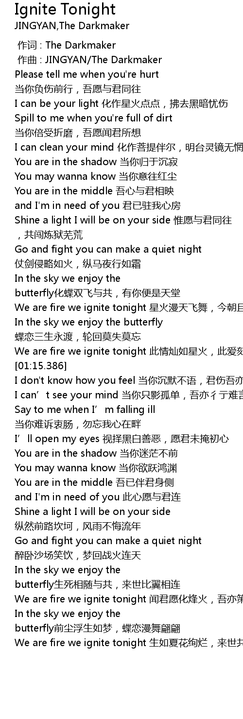 | [01:11.644] | We are fire we ignite tonight cǐ qíng càn rú xīng huǒ, cǐ ài kè gǔ míng shāng |