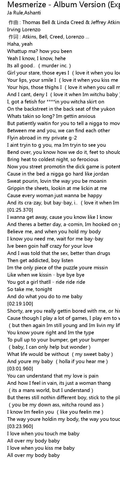| [01:19.930] | And its crazay, but baybay, i.. love it when Im witchu baby |