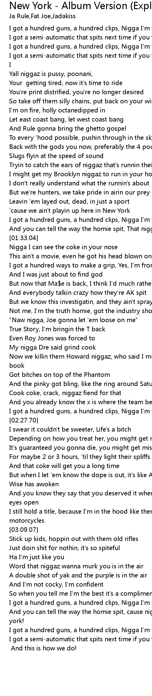 | [01:22.59] | I got a hundred guns, a hundred clips, Nigga I'm from New York |