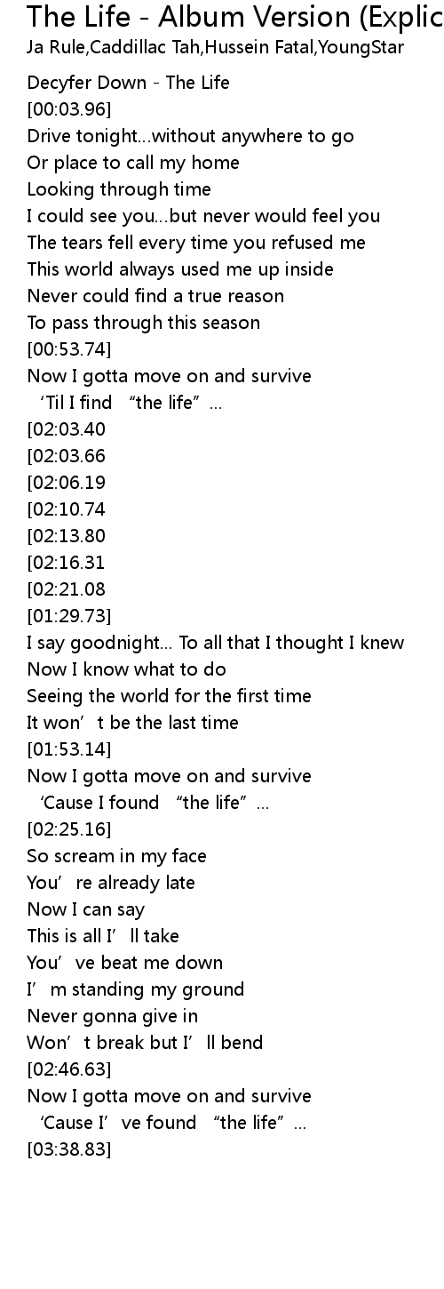 | [03:12.13][02:21.08][01:19.74] | I gotta have the life! |