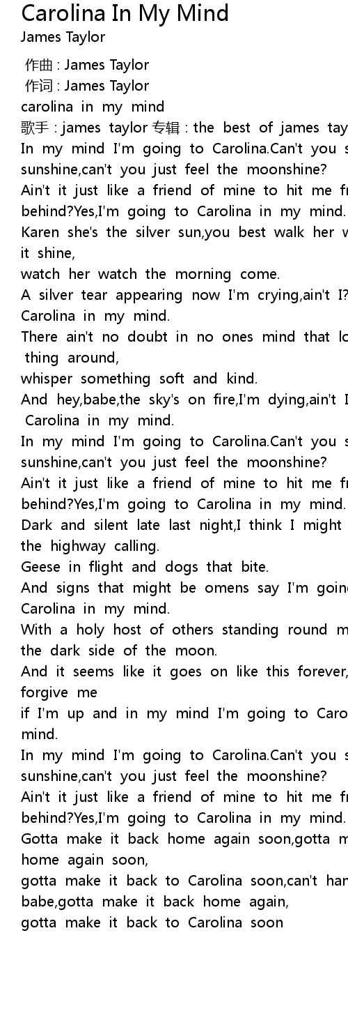 | [00:19.227] | Ain't it just like a friend of mine to hit me from behind?Yes,I'm going to Carolina in my mind. |