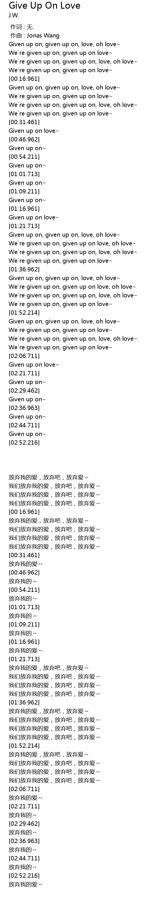 | [01:48.464] | We`re given up on, given up on, love, oh love~ |