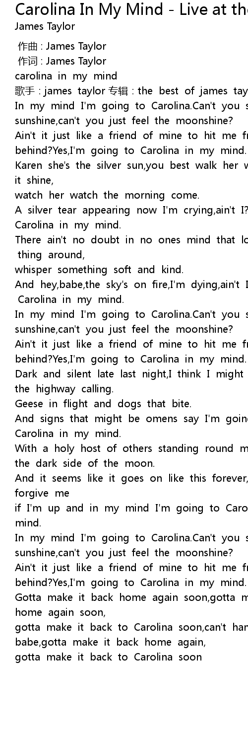 | [00:19.227] | Ain't it just like a friend of mine to hit me from behind?Yes,I'm going to Carolina in my mind. |
