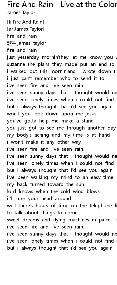 | [02:26.586] | i' ve seen fire and i' ve seen rain |