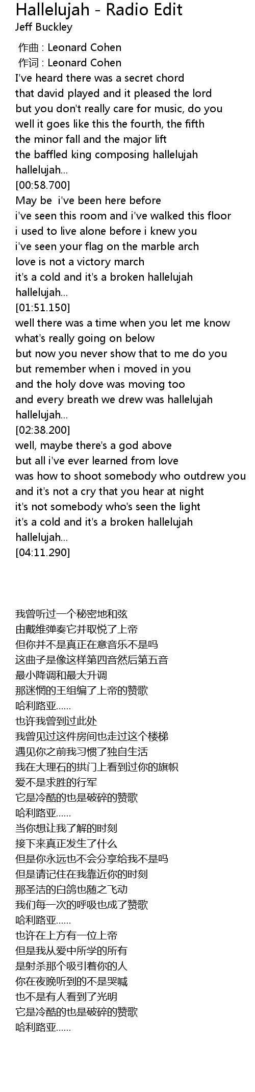 | [03:28.650] | it' s a cold and it' s a broken hallelujah |
