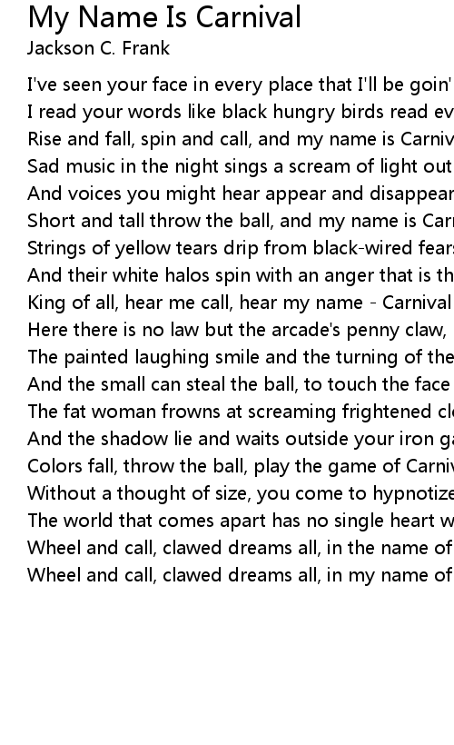 | Wheel and call, clawed dreams all, in my name of Carnival |