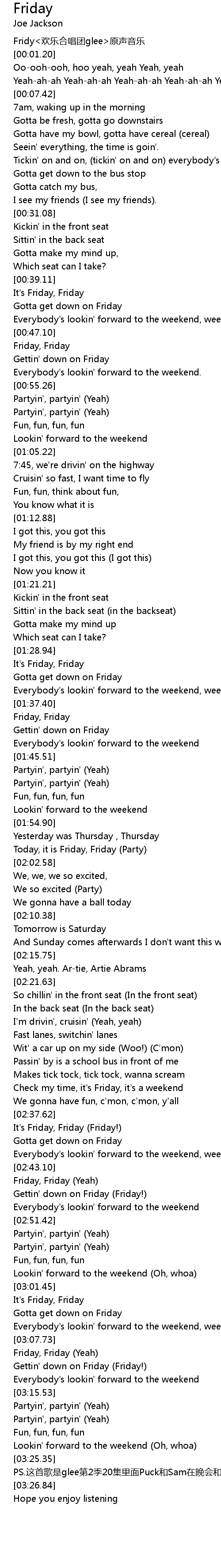 | [00:00.98] | Fridy<欢乐合唱团glee>原声音乐 |