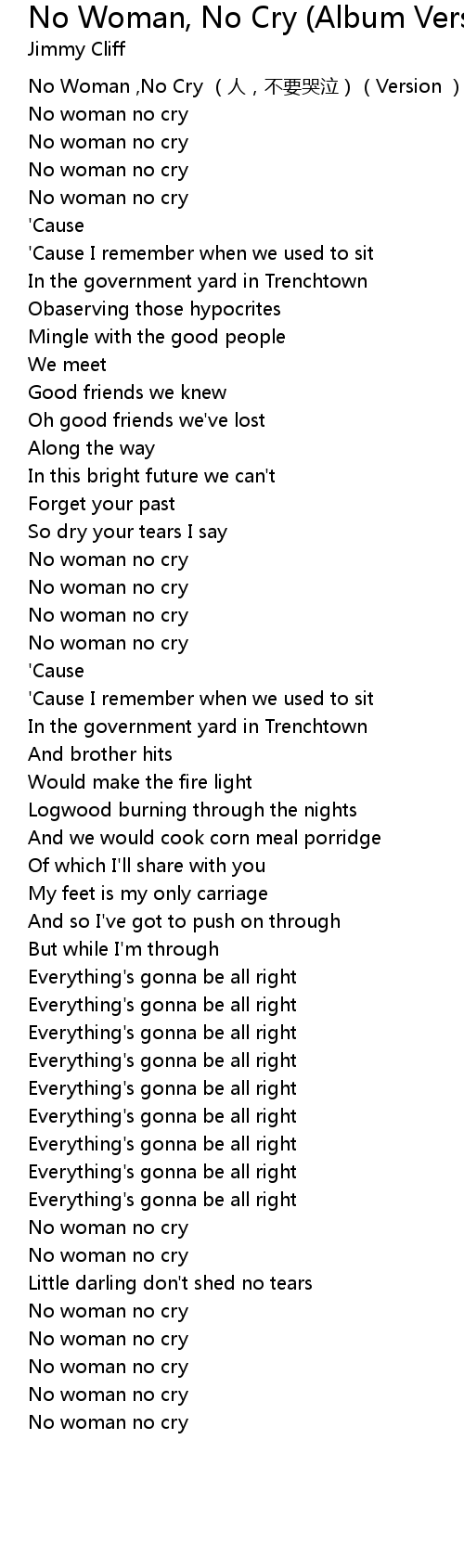 | [00:00.00] | No Woman , No Cry rén, bú yào kū qì Version Jimmy Cliff |