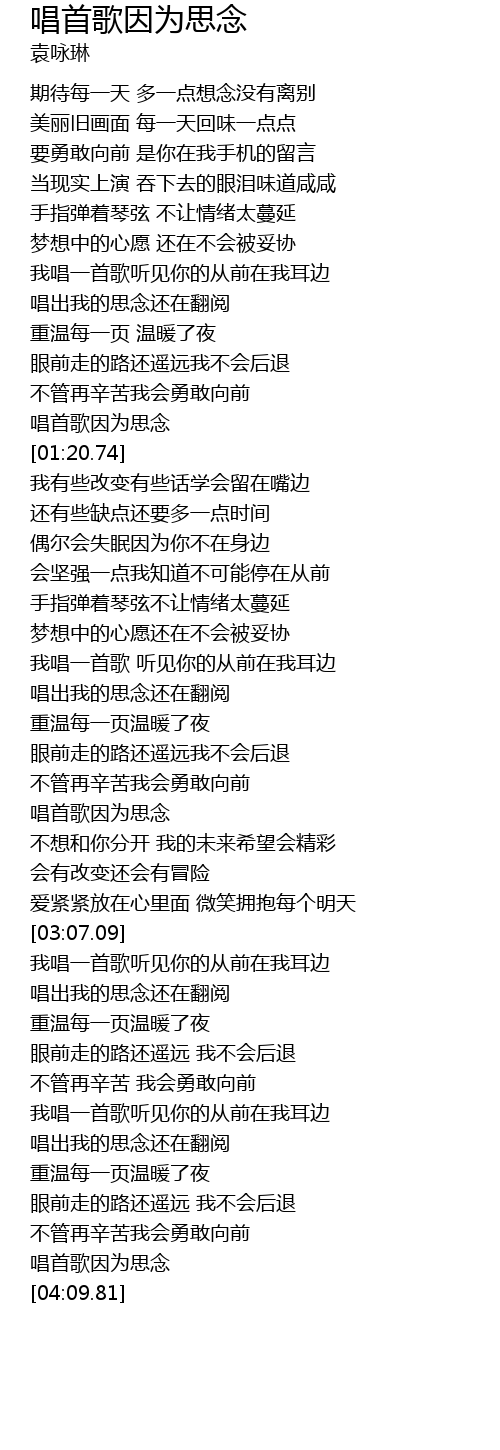 | [01:16.20] | chàng shǒu gē yīn wèi sī niàn |